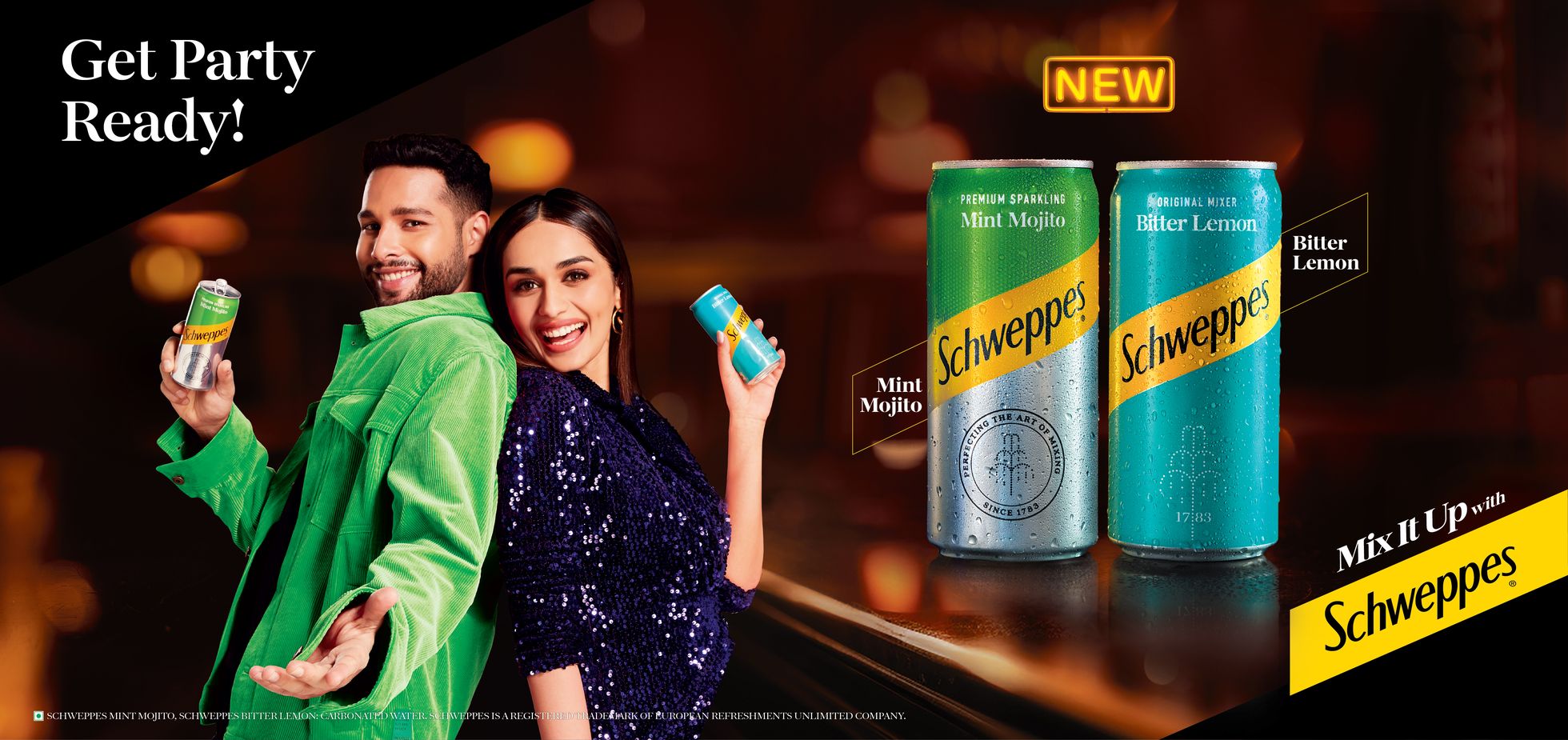 SCHWEPPES BITTER LEMON, SCHWEPPES MINT MOJITO: CARBONATED WATER. SCHWEPPES IS A REGISTERED TRADEMARK OF EUROPEAN REFRESHMENTS UNLIMITED COMPANY. DRINK RESPONSIBLY.